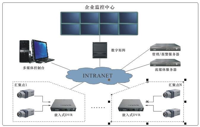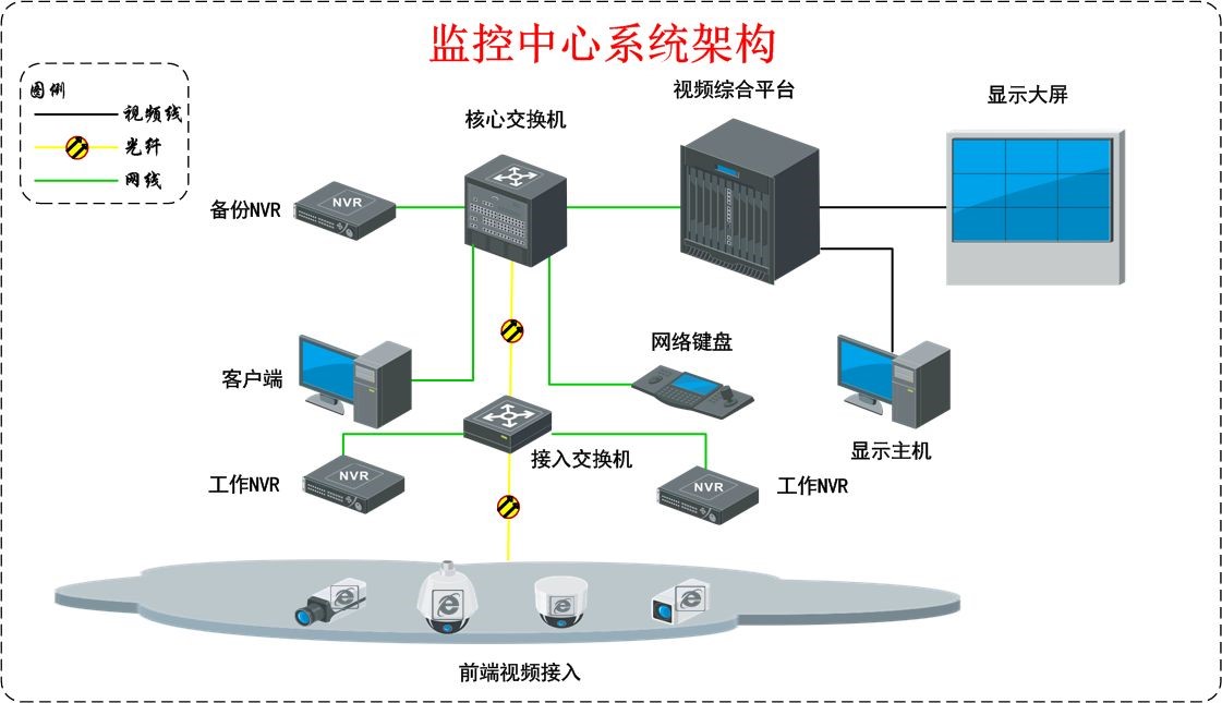 视频安防监控系统一般由前端、传输、控制及显示记录四个主要部分组成。前端部分包括一台或多台摄像机以及与之配套的镜头、云台、防护罩、解码驱动器等;传输部分包括电缆和/或光缆,以及可能的有线/无线信号调制解调设备等;控制部分主要包括视频切换器、云台镜头控制器、操作键盘、种类控制通信接口、电源和与之配套的控制台、监视器柜等;显示记录设备主要包括监视器、录像机、多画面分割器等。