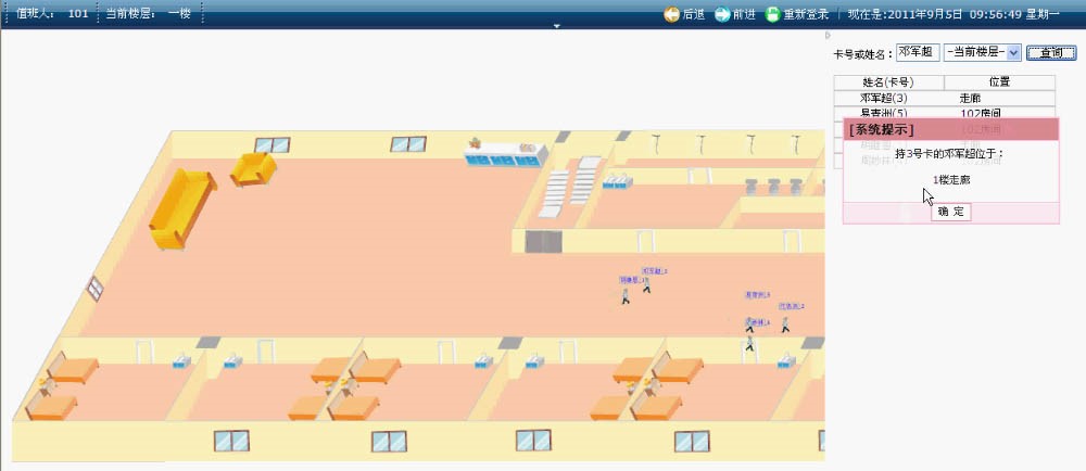 在监控终端输入任意人ID或名称即可立即查询到该人在福利院位置,并在电子地图上突出显示;也可在电子地图划定一定范围,查询此范围内人的信息; |