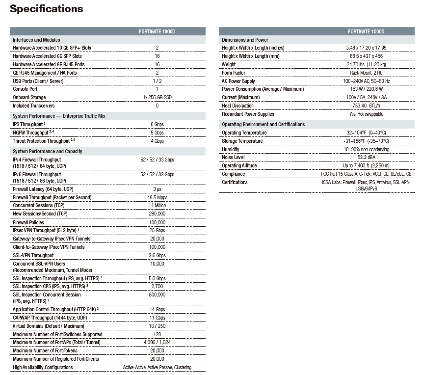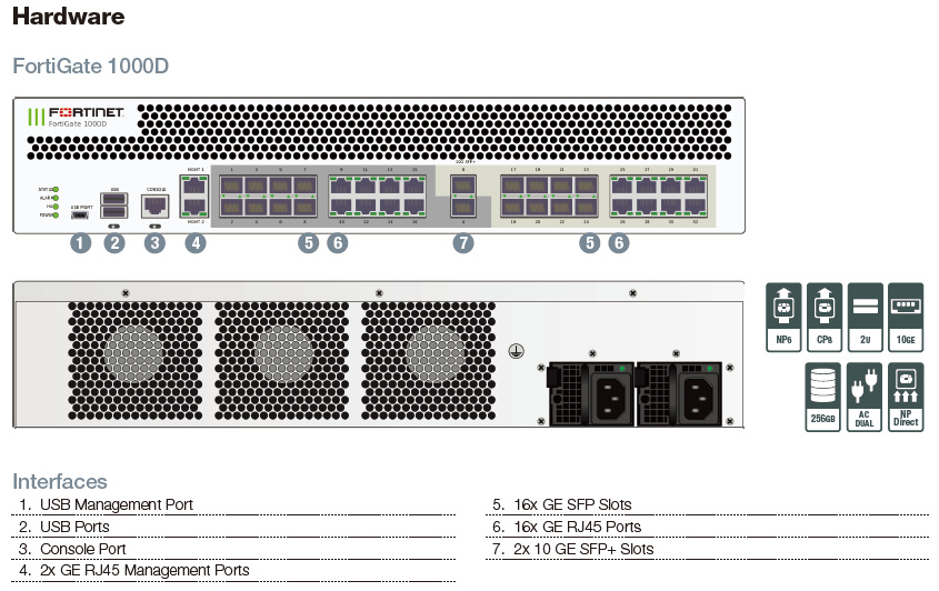 The FortiGate 1000D delivers high performance threat protection and SSL inspection for large enterprises and service providers, with the flexibility to be deployed at the enterprise/cloud edge, in the data center core or internal segments. The multiple high-speed interfaces, high port density, superior security efficacy and high throughput of the 1000D keeps your network connected and secure.