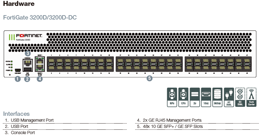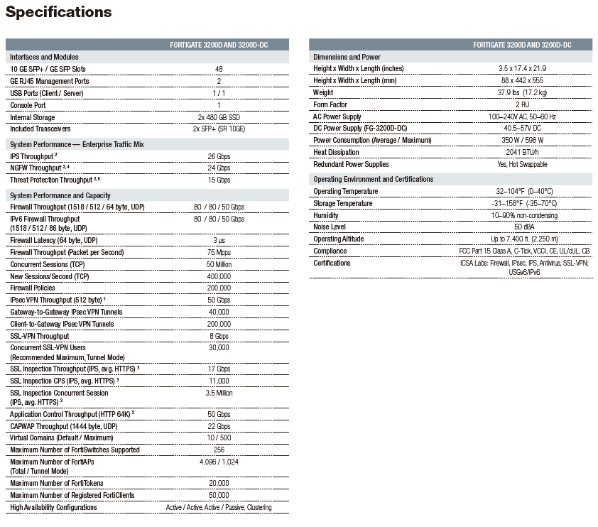 The FortiGate 3200D series delivers high performance threat protection and SSL inspection for large enterprises and service providers, with the flexibility to be deployed at the enterprise/cloud edge, in the data center core or internal segments. The multiple high-speed interfaces, high port density, superior security efficacy and high throughput of the 3200D series keeps your network connected and secure.